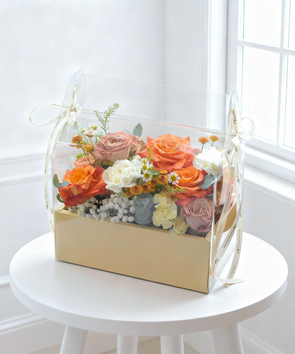 Thiết kế hộp trong suốt hiện đại. Phần đế vàng tạo cảm giác cao cấp. Hai bên được trang trí nơ kem thanh lịch. Bố cục sắp xếp cân đối và hài hòa. Tổng thể mang phong cách tinh tế nhưng vẫn nổi bật.