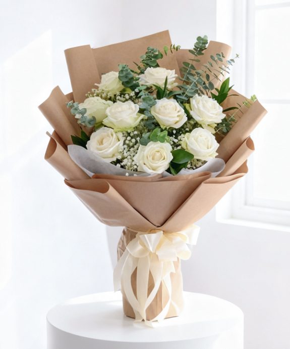 Thiết kế nhẹ nhàng và trang nhã Bó hoa hồng trắng mang đến cảm giác tinh tế và thuần khiết. Tông màu trắng chủ đạo tạo ấn tượng thanh lịch. Những đóa hồng nở tròn đều được sắp xếp cân đối. Tổng thể hài hòa và dễ nhìn. Hoa baby trắng được điểm xuyết khéo […]