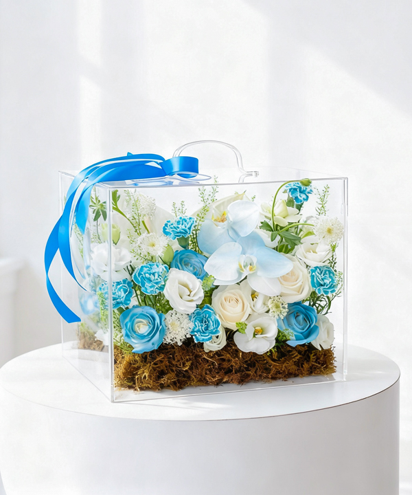 Những đóa hồng xanh được sắp xếp xen kẽ cùng hoa hồng trắng mềm mại. Hoa lan trắng nổi bật ở trung tâm. Hoa baby và hoa phụ nhỏ giúp bố cục thêm sinh động. Lớp rêu nâu bên dưới tạo chiều sâu tự nhiên. Thiết kế hộp mica trong suốt làm tăng vẻ hiện đại. Quai xách tiện lợi và nơ xanh tạo điểm nhấn thanh lịch.